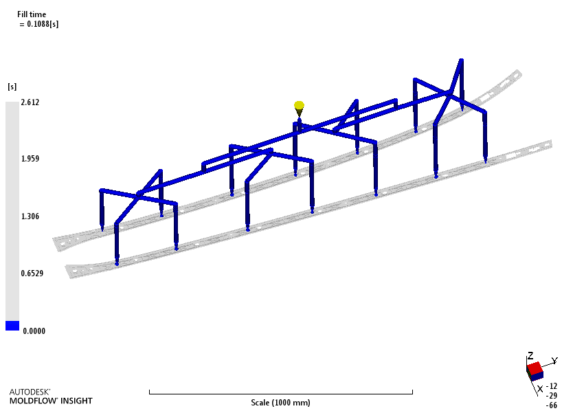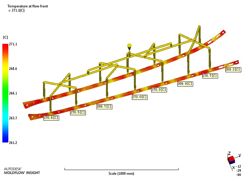 NO.1: The part is automotive exterior trimming part. The dimension is big and has high requirement on the structural strength. The injected resin is PA6+GF40%, in which requires high resistance on abrasion and corrosion. The nozzles are made with special material, which can ensure enough heat near the gate area and good resistance on abrasive and corrosion.